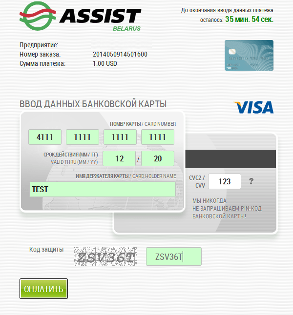 Оплата банковской картой VISA, MasterCard, БЕЛКАРТ, МИР через систему Assist Belarus